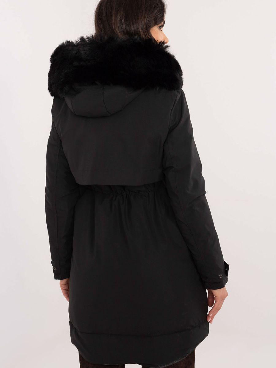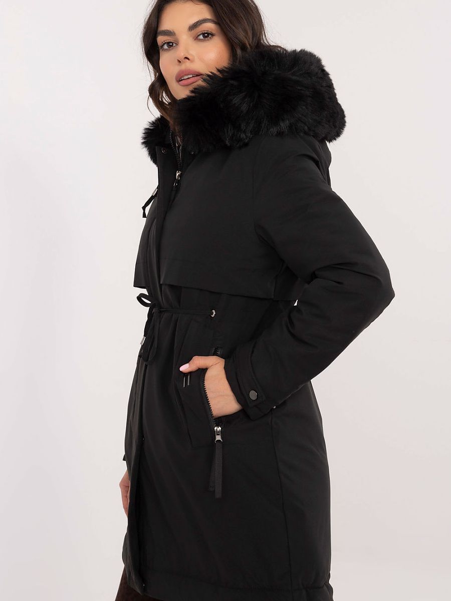 This jacket is the perfect choice for colder days. Made of high-quality polyester and filled with synthetic down, it will keep you warm and comfortable. The quilted form gives it a modern touch, and the detachable fur allows you to adapt the jacket to different styles and temperatures. An additional advantage is the practical waist belt, which emphasizes the silhouette and adds elegance. Practical and functional. The standard length before the knee and the zipper and snap fastening ensure comfort and security. A detachable hood protects you from wind and rain, while side zippered pockets will keep your essentials with you. Soft lining increases the comfort of wearing. Perfect for everyday wear. The universal, smooth design makes the jacket fit many styles. You can wear it both with jeans and sports pants.